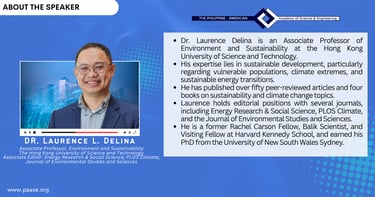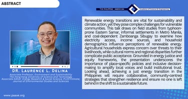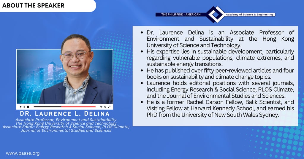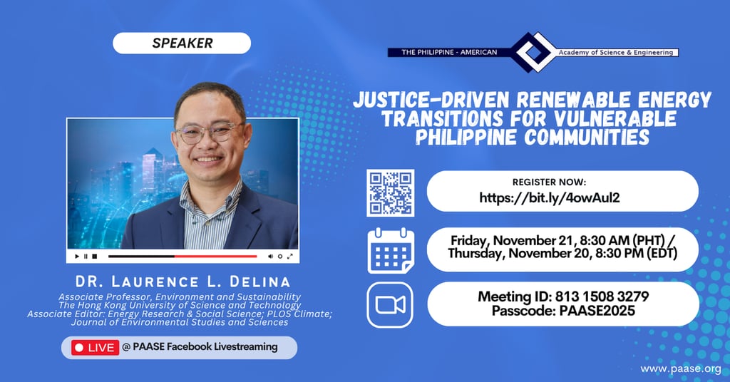 The Philippine-American Academy of Science and Engineering (PAASE) invites you to another insightful session of the PAASE Webinar featuring Dr. Laurence L. Delina, Associate Professor of Environment and Sustainability at The Hong Kong University of Science and Technology (HKUST). His talk is titled: Justice-driven renewable energy transitions for vulnerable Philippine communities.