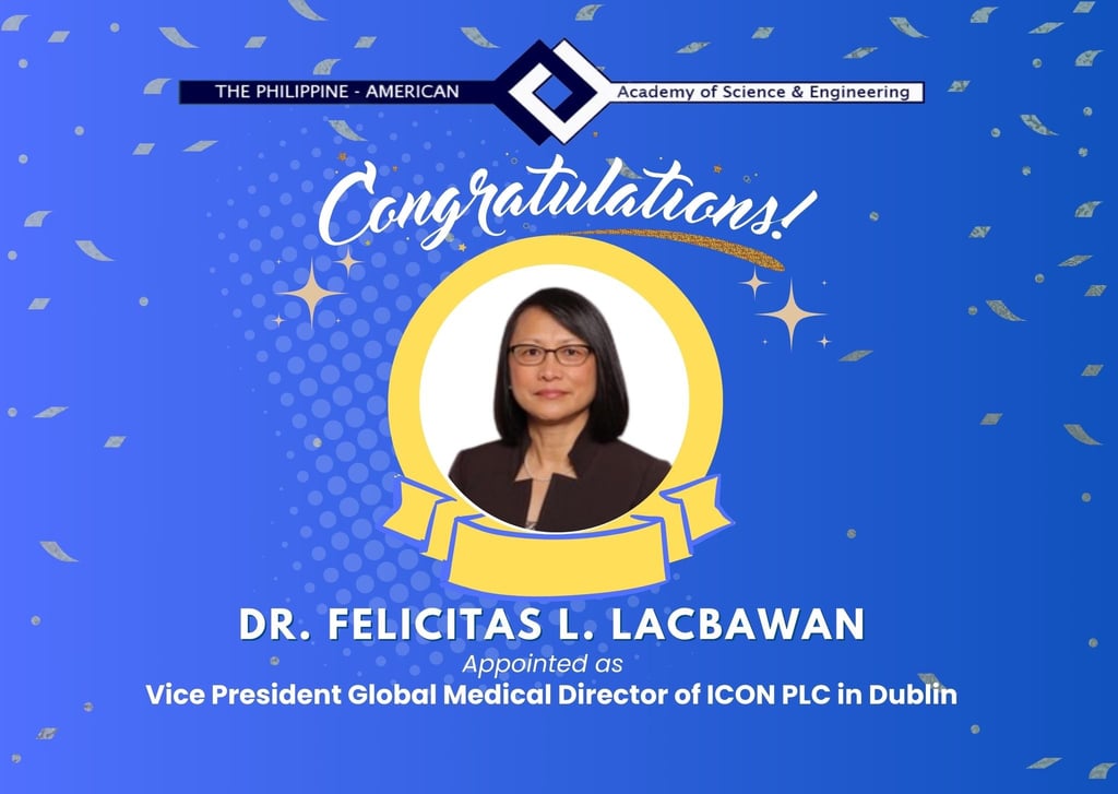 The Philippine-American Academy of Science & Engineering (PAASE) proudly congratulates Dr. Felicitas L. Lacbawan her appointment as Vice President Global Medical Director of ICON PLC in Dublin.