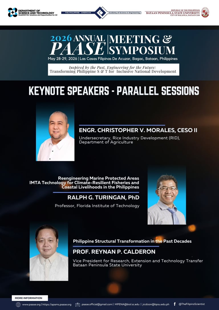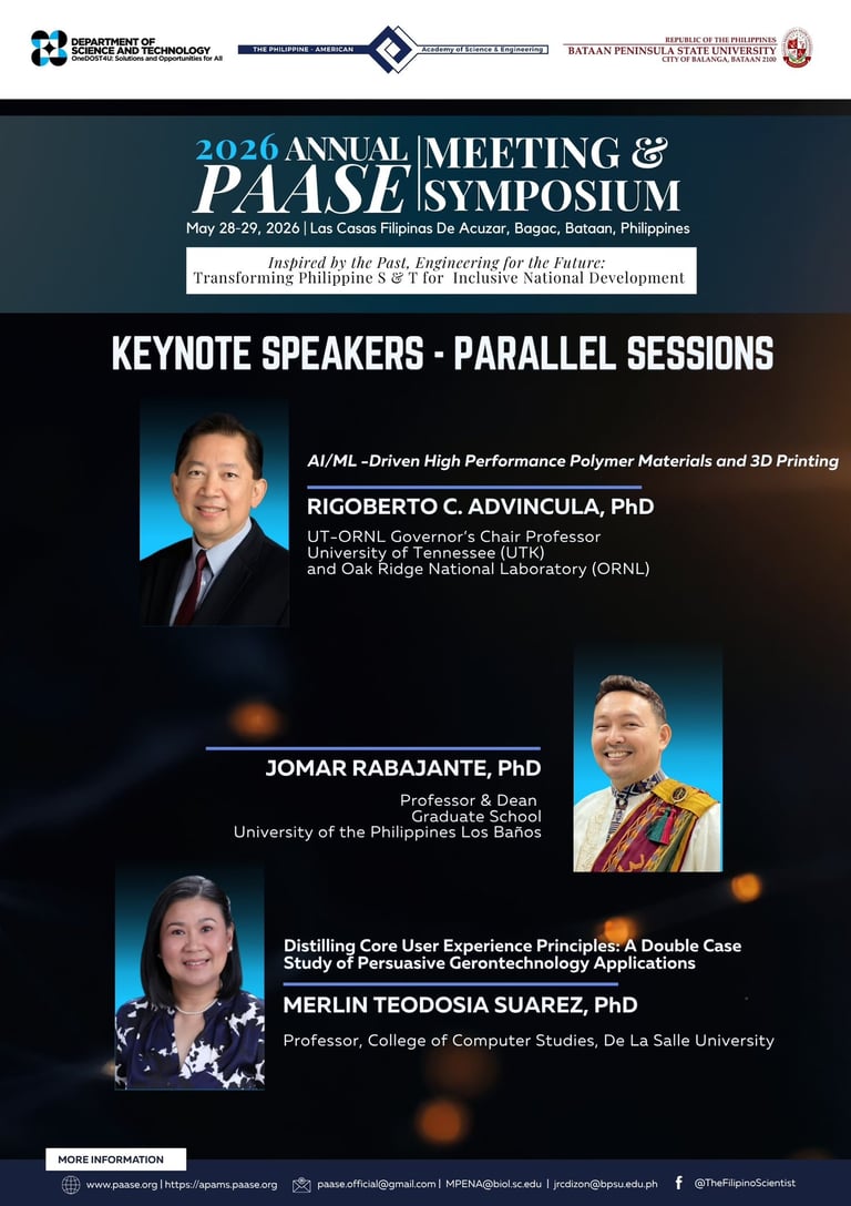 The Philippine-American Academy of Science and Engineering (PAASE), in partnership with the Department of Science and Technology (DOST) and Bataan Peninsula State University (BPSU), is honored to introduce two more Confirmed Plenary Speakers for the 2026 Annual PAASE Meeting and Symposium (APAMS):
