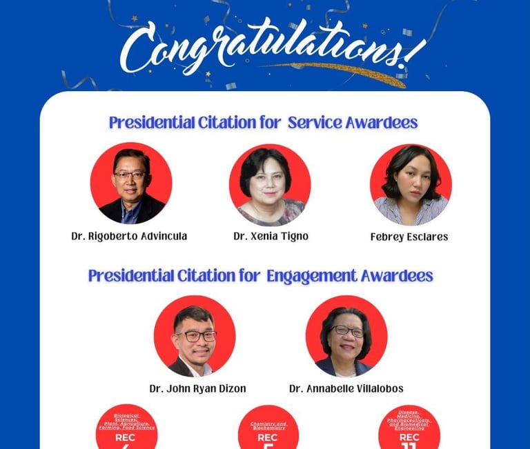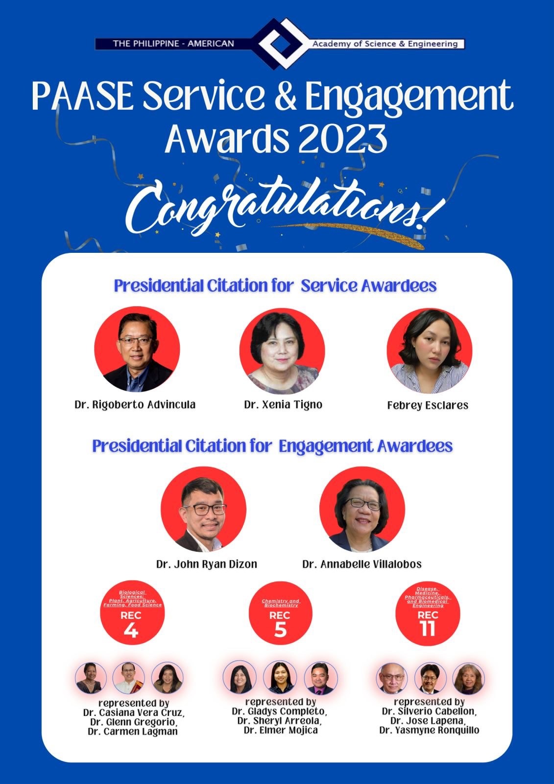 RIGOBERTO 'Gobet' ADVINCULA, PhD: In recognition of his unwavering and proactive commitment, demonstrated through outstanding leadership in compelling PAASE webinars and fireside chats, his adept management and editorial contributions to SciEnggJ, and his enduring leadership as a Board of Directors member and former president.