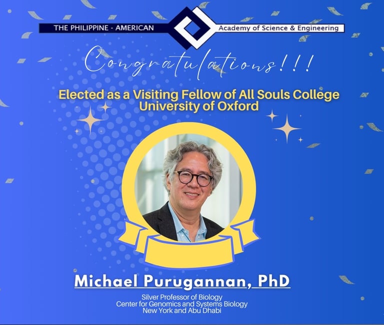PAASE would like to extend our warmest congratulations to Dr. Michael Purugannan, Silver Professor at the Center for Genomics and Systems Biology, New York University, for his being elected as one of the Visiting Fellows of All Souls College. One of the constituent colleges of the University of Oxford in England, All Souls College was founded in 1438 by Henry Chichele, the Archbishop of Canterbury at the time. The college's original purpose was to provide an education for the "travelling fellows" or chaplains who were associated with the Archbishops of Canterbury.